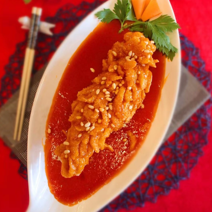 用鱼切花炸成形用茄汁加上松子口感超级好甜酸